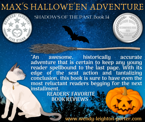 Max's Hallowe'en Adventure (Max's Adventures Book Five) by Wendy Leighton-Porter is a hair-raising Halloween adventure short story complete with witches, cauldrons, and spooky black cats. Fans of Max the talking Tonkinese cat will be thrilled and chilled with this eerie episode. Written as a tie-in for its sister series, The Shadows Of The Past, this book will have any young reader entwined in the turbulent times of the Salem Witch Trials when neither humans nor cats were safe. This story is the enticing prequel to the upcoming Shadows Of The Past story, The Shadow of The Witchfinder; another awesome, historically accurate adventure that is certain to keep any young reader spellbound to the last page. With its edge of the seat action and tantalizing conclusion, this book is certain to have even the most reluctant readers begging for the next installment! As an avid fan of Ms. Leighton-Porter's books, I found that this newest story does not disappoint. I love how the author recounts the origins of Halloween and weaves a tragic part of history into such a fascinating tale, giving the reader a delicious morsel of what is to come. I appreciate how the author takes the time to explain history at the end of her books and encourages young readers to do their own follow-up studying. I would recommend this book for readers that love adventure, action, and Halloween."